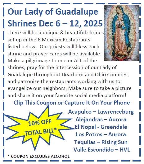 • Our Lady of Guadalupe Shrines ~ Dec 6-12 ~ Our pastors will be blessing shrines at six area Mexican restaurants. Visit one or all of them and get 10% off your meal! Clip this coupon.