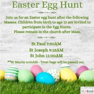 Please remain in the church after Mass. Children are asked to bring a basket or bag to collect their eggs.