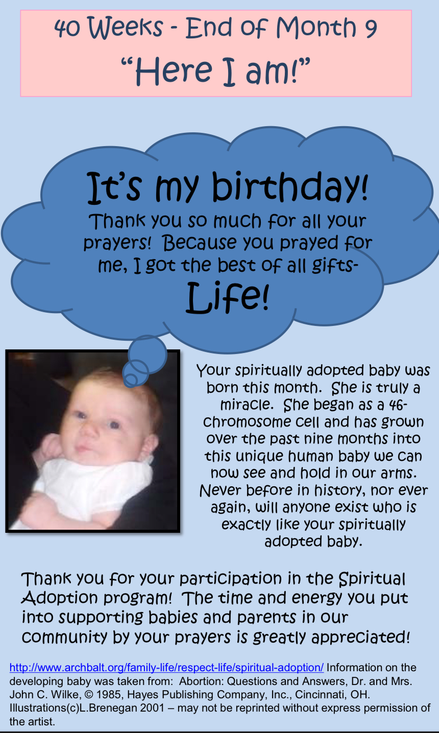 Starting January 19, 2025- Participants have adopted a specific, but unknown unborn baby who is in danger of abortion. As the adoptive spiritual parents, we will name our little ones. Our commitment is to pray for our babies for 9 months (January to October). During this time, we will hear updates about their development. At the end of the nine months, we will have a baby shower celebration in the spirit of hope and gratitude that our spiritual-adopted babies have survived.