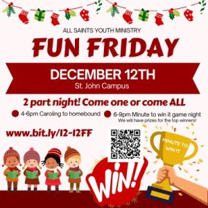 All 8th to 12th Graders are welcome to an evening of fellowship! There will be games, a presentation on the faith, testimony, Adoration, small groups, food and drinks. Come and hang with old and new friends. Youth from other parishes and faiths are also welcome!